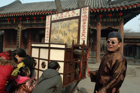 A folk artist displays peep show to tourists on a temple fair in Zhengding of North China's Hebei Province on the Lunar New Year, February 7, 2008. China kicked off a week-long New Year celebration from February 6. [Xinhua]