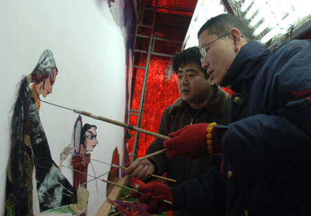 Two folk artists perform a shadow play on a temple fair in Zhengding of North China's Hebei Province on the Lunar New Year, February 7, 2008. China kicked off a week-long New Year celebration from February 6. [Xinhua]