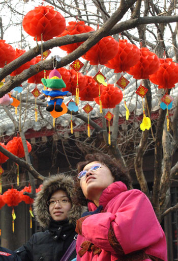 Two tourists look at puzzles on a temple fair in Zhengding of North China's Hebei Province February 7, 2008, the Chinese Lunar New Year's Day. China kicks off a week-long New Year celebration from February 6. [Xinhua]