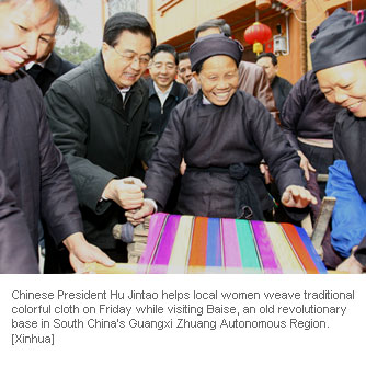 NANNING - President Hu Jintao spent the Spring Festival, a traditional family reunion holiday for the Chinese, in southern Guangxi Zhuang Autonomous Region, which was heavily hit by the worst winter storm in five decades.