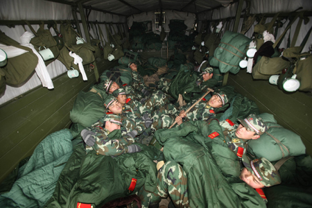 Exhausted Chinese soldiers fall asleep in a truck after they had cleaned snow and ice for eight days and nights on the highway, a major north-south trunk road, Feb. 4, 2008. The Chinese officials announced the Beijing-Zhuhai Expressway was fully reopened Monday morning. [Xinhua]