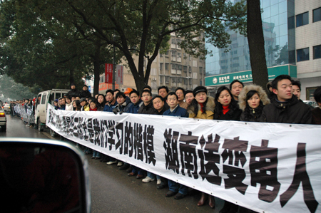 People in Changsha, the capital city of central China's Hunan Province, bid farewell to Luo Haiwen, Luo Changming and Zhou Jinghua who were taken down by the power pylon when they were repairing the electricity. The tower collapsed under the weight of ice. [Xinhua]