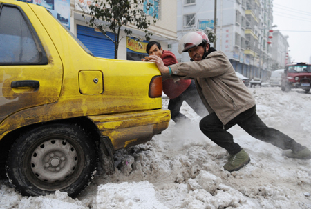 Two men give a hand to a driver whose car is stranded by snow in Kaiyang county, the southwestern Guizhou Province, Feb. 5, 2008. [Xinhua]