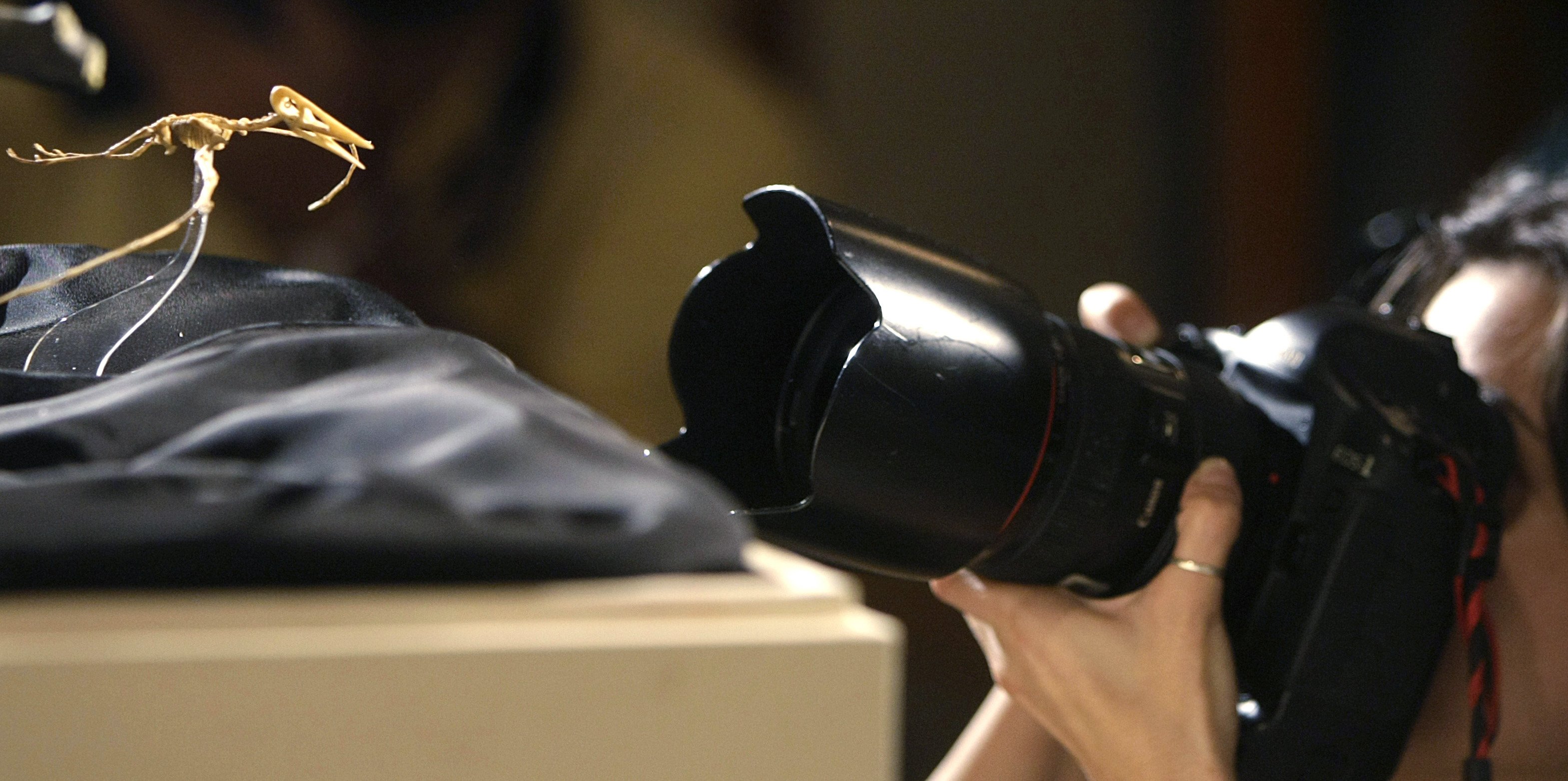 A photographer takes a picture of a model of new species of tiny prehistoric flying reptile (Nemicolopterus crypticus) after a news conference in Rio de Janeiro February 11, 2008. Brazilian palaeontologists on Monday announced the discovery of the miniature reptile, the smallest flying reptile ever found, in north-eastern China. [Agencies]
