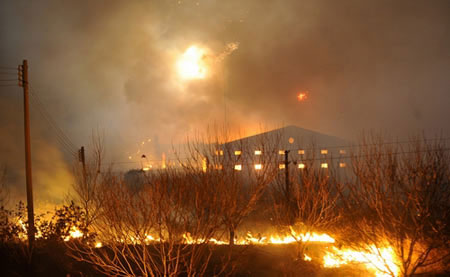 The blast occurred around 3:30 a.m. on Thursday in Sanshui district, Foshan City, which is in the southern province of Guangdong. Several heavy explosions were heard and the blasts set neighboring woods on fire, an official with the Foshan city government said. Four security guards who were watching the 11-hectare warehouse area and nearby villagers were evacuated. More than 650 police, fire-fighters and soldiers were fighting to contain the fire, he said. The local newspaper Foshan Daily said that the explosions lasted over a five-hour period and steel structural debris was found 1,000 meters away on a highway. Windows in homes about 5 kilometers away were shattered, and many local residents were quoted as saying they thought that the area had been hit by an earthquake. Photos showed blazing warehouses and firecrackers exploding in the air. Most of the fireworks were made in Hunan and Jiangxi provinces and had been temporarily stored in the warehouses, owned by a local company, for export. |