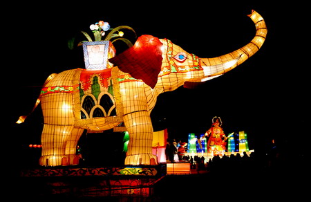 A giant lantern in the shape of an elephant is displayed at the People's Park in Zhengzhou, capital of Henan Province, ahead of the upcoming Lantern Festival February 14, 2008. [Xinhua]