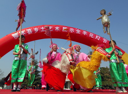 An amateur ensemble performs folk dancing to celebrate the upcoming Lantern Festival in Xiushui County, East China's Jiangxi Province, February 14, 2008. The Chinese Lantern Festival falls on the 15th day of the first lunar month, when people eat dumplings made with glutinous rice flour and look at lanterns. [Xinhua]