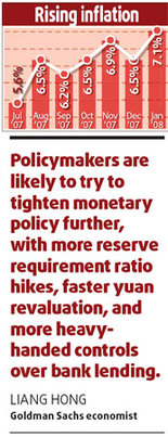 China raised its interest rate six times last year and ordered domestic lenders to set aside more cash as reserves on 10 occasions. The moves were aimed at cooling down the economy and reining in inflation. Lehman Brothers' Sun Mingchun said inflation would start easing next month as movement of traffic on the country's major expressways gets normal. Some economists said earlier the government may loosen its austerity drive this year because of a slowdown of the world economy triggered by the US subprime crisis. But Liang said: "On the contrary, policymakers are likely to try to tighten monetary policy further, with more reserve requirement ratio hikes, faster yuan revaluation, and more heavy-handed controls over bank lending." The revaluation of the yuan has accelerated since November, because the government can use it to reduce its cost for fuel and raw materials, analysts say. The yuan rose about 1.6 percent against the US dollar in January, the fastest monthly gain since China de-pegged it from the greenback in favor of a basket of currencies, including the euro, yen and the dollar in 2005. |