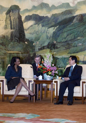 Chinese President Hu Jintao (R) meets with US Secretary of State Condoleezza Rice at the Great Hall of the People in Beijing, February 26, 2008. [Agencies]