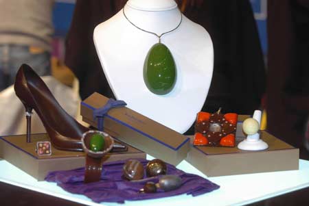 A high-heeled shoe and some ornaments made of chocolate are exhibited during a promotion for the opening of a French chocolate shop in Hong Kong, China, Feb. 27, 2008. Many chocolate ornaments exhibited here were shown to the public for the first time. [Xinhua]