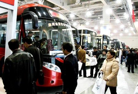 Visitors experience a city rapid transport bus during 2008 China International Coach Exhibition in Suzhou, East China's Jiangsu Province, Mar. 3, 2008. [Xinhua]