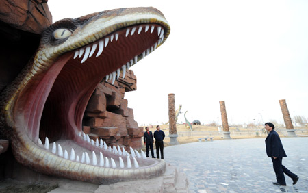 Visitors amuse themselves at a dinosaur park in Karamay of northwest China's Xinjiang Uygur Autonomous Region March 4, 2008. [Xinhua]