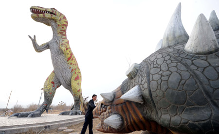 A visitor walks at a dinosaur park in Karamay of northwest China's Xinjiang Uygur Autonomous Region, March 4, 2008. [Xinhua]