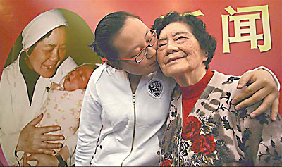 Zheng Mengzhu (L), China's first test-tube baby, now 20, kisses professor Zhang Lizhu, 87, who helped her mother fall pregnant via in vitro fertilization - at a ceremony last month in Beijing. [China Daily]