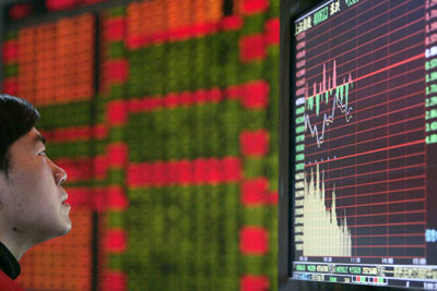 A man reads information on an electronic screen at a brokerage house in Shanghai March 13, 2008. China's main stock index tumbled below 4,000 points on Thursday to close at 3971.26 points for the first time in seven months, hit by concern about inflation and the market's ability to absorb large new supplies of shares. [Agencies]
