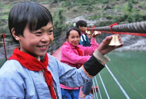 Students living in a nearby village tie copper bells onto the steel bridge. [Yunnan Daily]