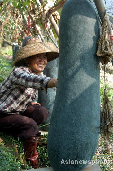 A female farmer looks at a huge Chinese wax gourd with a weight of 34.5 kilograms in Qionghai, South China's Hainan Province March 17, 2008. It is the largest of its kind in the city's history. [Asianewsphoto]