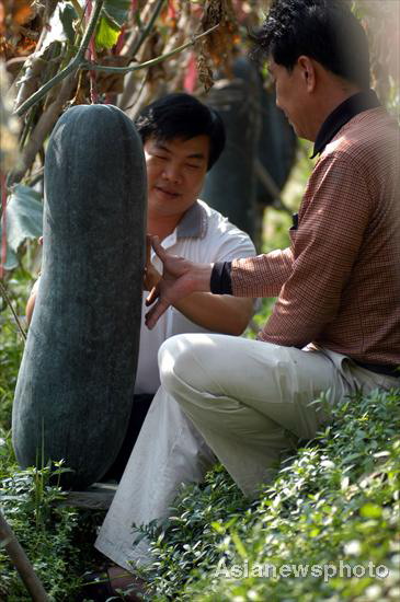 Agricultural technicians measure a huge Chinese wax gourd with a weight of around 33 kilograms in Qionghai, South China's Hainan Province March 17, 2008. [Asianewsphoto]