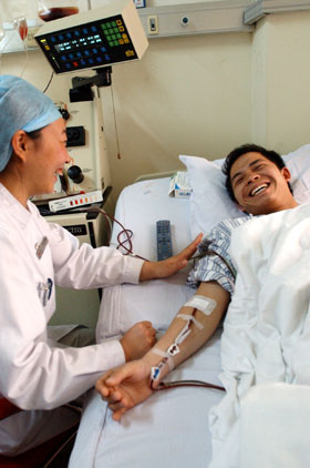 A nurse talks with Lu Xiaojun on Tuesday at Daopei Hospital in Beijing while extracting blood stem cell. [Xinhua]