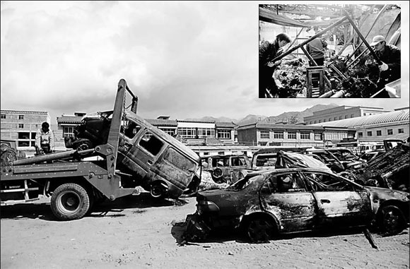 Workers from the environmental protection bureau in Lhasa dispose of vehicles destroyed during rioting last week. Inset: Three workers clear debris from a shop after it was torched. [China News Service]