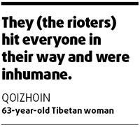 "They (the rioters) hit everyone in their way and were inhumane," said Qoizhoin, a 63-year-old Tibetan woman who was hospitalized after being injured on the way home.