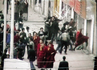 A monk (first right) tries to break the door of a shop in Lhasa. [Tibet Daily]