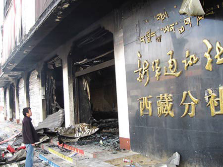 A man looks at the Xinhua News Agency Tibet Branch office smashed and burnt by rioters March 14, 2008. [Xinhua]