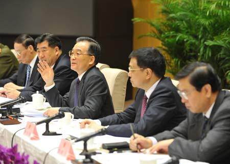 Chinese premier Wen Jiabao(3rd, L), speaks during the first plenary session of the State Council, or the Cabinet, in Beijing, capital of China, on March 21, 2008. [Xinhua]