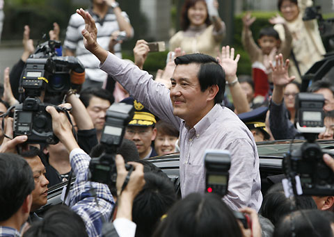 Taiwan's Kuomintang (KMT) candidate Ma Ying-jeou waves to spectators after he casts his vote for Taiwan's leadershiop election in Taibei March 22, 2008. [Agencies]