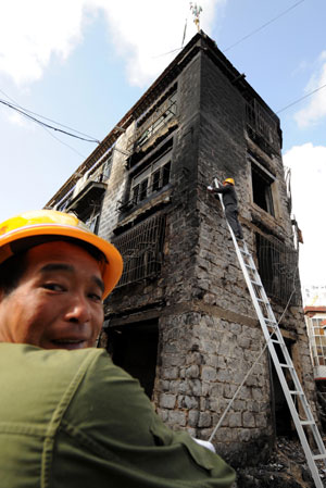 Workers repair a building damaged in the March 14 riots in Lhasa March 23, 2008 as Lhasa returned to normalcy after the March 14 riots. [Xinhua]