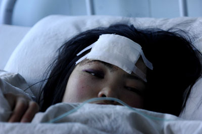 Wang Qian, a clerk of Lhasa Mobile office, is treated in a hospital for injuries in this March 16, 2008 photo. She was badly injured during the riots in Lhasa on March 14. [Xinhua]