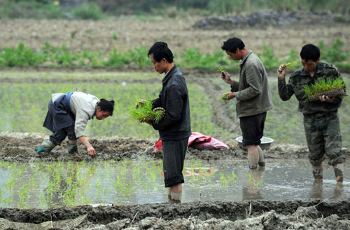 Farmers plant rice seedlings in Tianlin County in Baise of South China's Guangxi Zhuang Autonomous Region March 27, 2008. [Xinhua]
