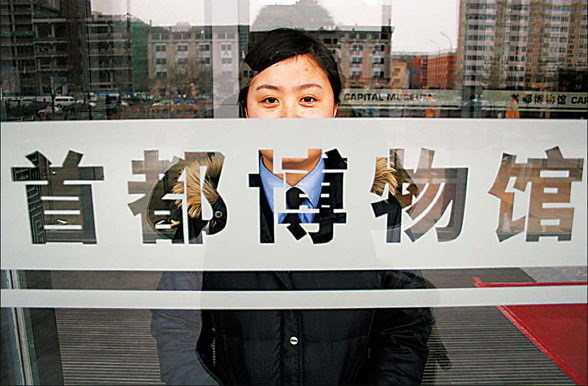 A visitor looks through a window inside the Capital Museum in Beijing in this undated photo. The Capital Museum is among dozens of others in the capital to open the public free of charge. [China Daily]