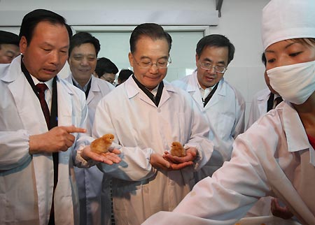 Chinese Premier Wen Jiabao (C) inspects a chicken farm during his work trip in Handan City, north China's Hebei Province, April 6, 2008. Wen said Sunday that the Chinese people are fully capable of feeding themselves.[Xinhua]