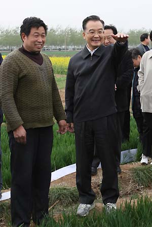 Chinese Premier Wen Jiabao (front R) chats with a villager during his work trip in Shilipu Village, Shahe City, north China's Hebei Province, April 5, 2008. [Xinhua]