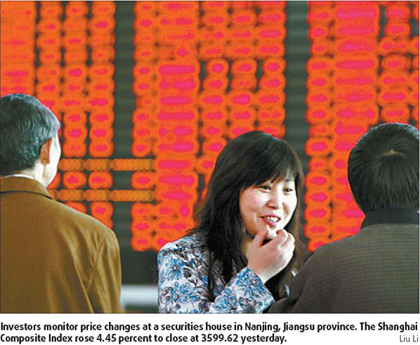 The benchmark Shanghai Composite Index surged 153.38 points to close at 3599.62, with 859 of 911 stocks closing higher. The Shenzhen Component Index soared 5.88 percent to close at 13396.61.