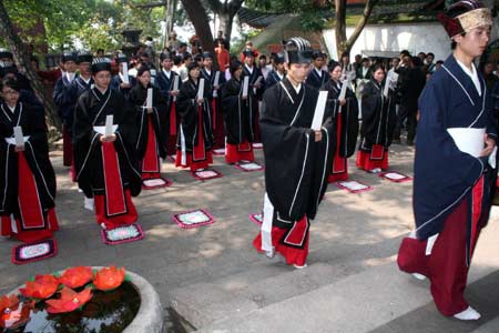 People dressed in traditional costumes perform during a sacrificial ceremony to pay homage to Qi Jiguang, a general in the Ming Dynasty (1368--1644) fighting against Japanese pirates, in Fuzhou, capital of East China's Fujian Province, April 6, 2008. A memorial ceremony was held in Fuzhou to mark the 420th anniversary of his death. [Xinhua]