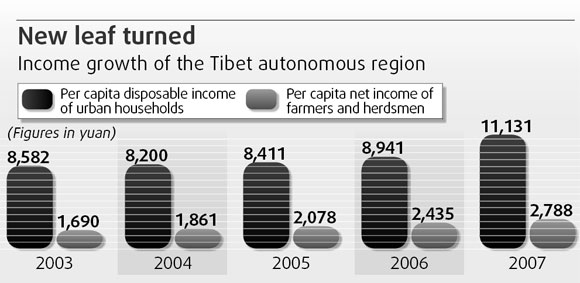 Over the past seven years, Tibet's gross domestic product has grown by more than 12 percent a year. Last year, its GDP was 34.2 billion yuan ($4.88 billion) and its per capita GDP 12,000 yuan, he said at a news conference.