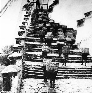 Serfs carry goods to the Potala Palace in this file photo. [China Daily]