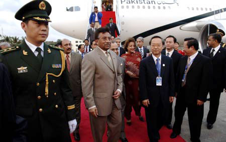 Pakistani President Pervez Musharraf (2nd L Front) arrives at the airport in Sanya, south China's Hainan Province, April 10, 2008. [Xinhua]