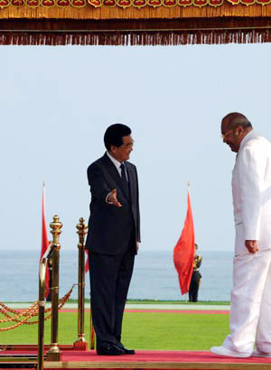 Chinese President Hu Jintao (L) gestures to Tongan King Taufa'ahau Tupou V (R) during the welcoming ceremony President Hu hosts for King Taufa'ahau Tupou V in Sanya, south China's Hainan Province, April 10, 2008. Tongan King Taufa'ahau Tupou V arrived in Sanya on Wednesday evening, kicking off a seven-day state visit to China. [Xinhua]