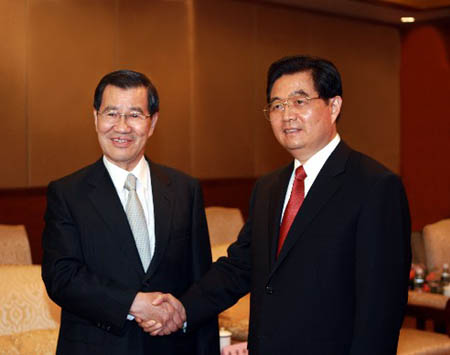 Hu Jintao (R), general secretary of the Communist Party of China Central Committee, shakes hands with Vincent Siew, chairman of the Taiwan-based Cross-Straits Common Market Foundation, in Boao, South China's Hainan Province, April 12, 2008. [Xinhua]