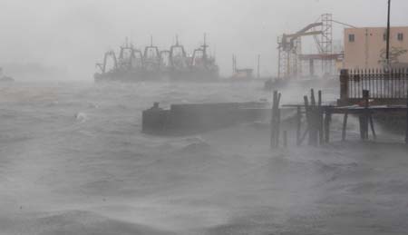 Ships sway in strong wind at the Qinglan harbor of Wenchang City, South China's Hainan Province, April 18, 2008. About 120,000 people have been evacuated from fish farms and low-lying coastal areas to safer places in the province as Typhoon Neoguri approaches the island. Neoguri was 120 kilometers southeast of Wenchang City at 3 p.m. on Friday, packing winds of about 120 km per hour. It is forecast to make landfall in the coastal area of Wenchang between midnight on Friday and 4 a.m. on Saturday. [Xinhua]