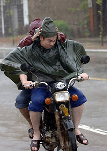 A motorcyclist braves his way in Wenchang, Hainan province April 18, 2008 as Typhoon Neoguri reaches South China and weakens into tropic storm. [Xinhua]