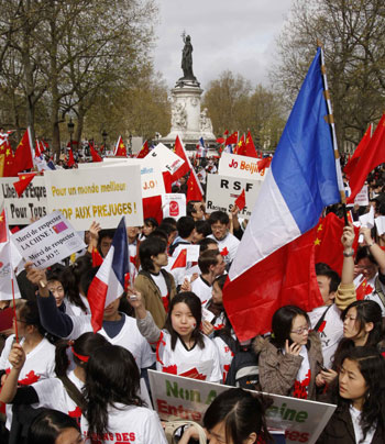 Thousands of Chinese students and expatriates demonstrate to support the upcoming Beijing Olympics and denounce some French media for their distorted reports on the March 14 Lhasa riots, in Paris April 19, 2008.  [Agencies]