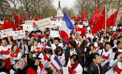 Thousands of Chinese students and expatriates demonstrate to support the upcoming Beijing Olympics and denounce some French media for their distorted reports on the March 14 Lhasa riots, in Paris April 19, 2008.  [Agencies]