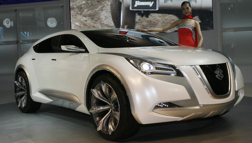 A model poses beside the Suzuki Kizaski at the Auto China 2008 in Beijing April 20, 2008. The show is open to the public from April 24-28, with press and trade days on April 20-23. [Agencies]