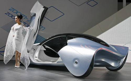 A model poses beside the Mazda Taiki at the Auto China 2008 in Beijing April 20, 2008. The show is open to the public from April 24-28, with press and trade days on April 20-23. [Agencies]