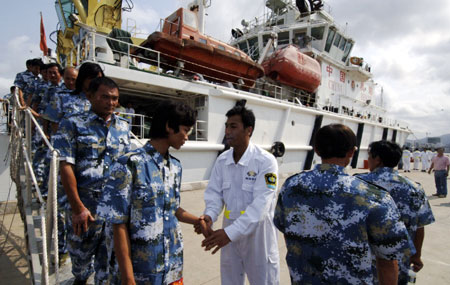 26 rescued Chinese fishermen say goodbye to a rescue staff member (in white) in Sanya, South China's Hainan Province, April 21, 2008. [Xinhua] |