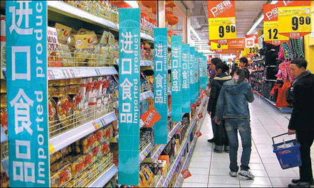 Customers select imported food in a supermarket in Ningbo, Zhejiang province, in this file photo. Many foreigners living in the country are feeling the pinch of rising food prices and the US dollar weakening against the yuan. [China Daily]